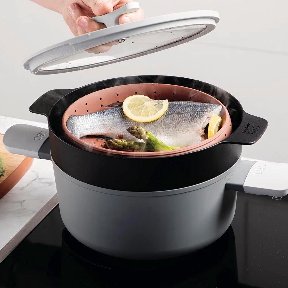 Whether you want to make dinner for the entire family, steam healthy vegetables, this 5 piece set is up for the job. With their aluminum body that guarantees a fast and even heat distribution and high-quality non-stick coating which allows you to cook with little to no oil, these pans ensure an efficient performance on any kind of stove, induction included. On top of that, the sturdy stay-cool handle that’s soft to the touch provides a good grip so you can safely take the pan from the stove to the table for serving where the non-stick coating guarantees an easy food release.Â