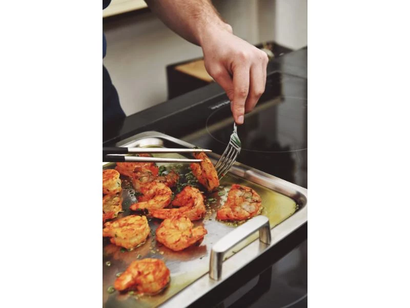 The 13.75″ teppanyaki is great for low-fat cooking since a minimum of fat is needed. Simply add a bit of suitable oil (olive oil splatters too much) and you’re cooking the most delicious recipes in no-time. 5-ply polished outside and satin-finished inside with casted steel handles. Also, the pan is made with high quality 18/10 Stainless Steel.