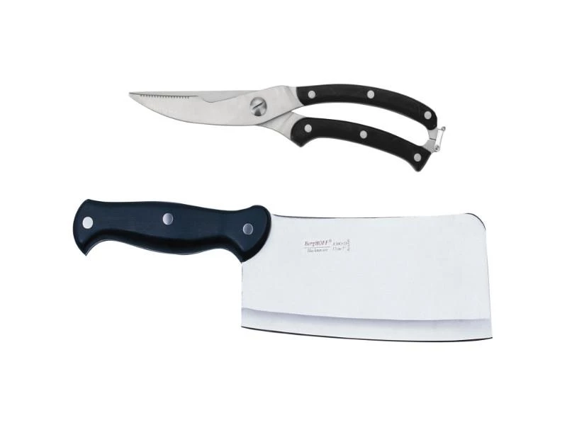 Set Includes: 7″ Riveted Cleaver, 8″ Poultry Shears. The riveted cleaver gives you that punch of power you need to cut through bone, and maybe even crush that clove of garlic for your meal. Never leave your kitchen without cutting sheers. Keep them handy for stubborn plastics or cutting meats into smaller portions. Completely multi-functional and a great addition.