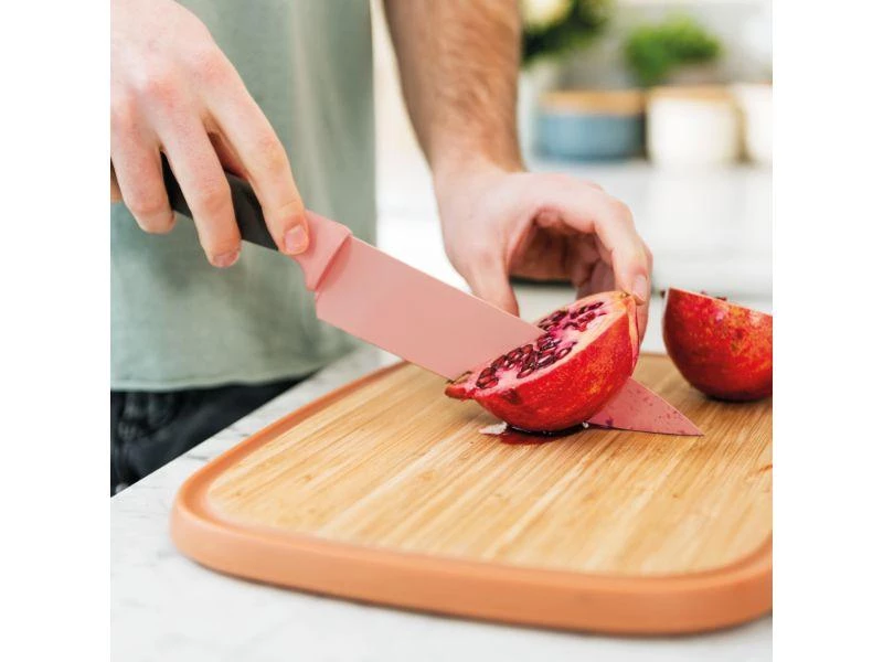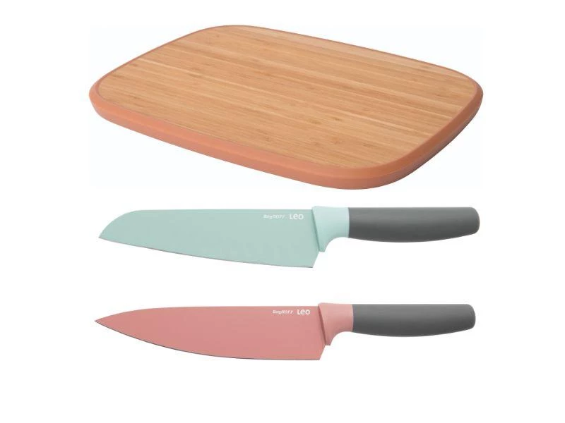 The Leo collection is the perfect addition to any cooks’ kitchen. With its bold colors and sharp innovations, this collection is sure to please. This set includes a bamboo cutting board, santoku knife and a chef’s knife. The non-stick blades and soft handles are sure to add comfort while preparing meals for yourself or your family. This set will round out your current assortment and will quickly become your favorite tools for any job!