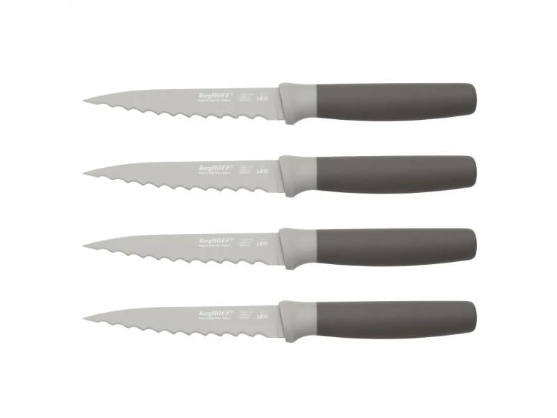 Whether you’re serving a sizzling steak right off the grill, a baked pork chop or a crispy pizza, the Leo steak knives are sure to cut the mustard. Your dinner guests will love the way the sift-grip handle fits in their hand and how the serrated stainless steel blade slices right through the meat thanks to its sharp teeth and non-stick coating. Let the Leo knives be your inspiration for a lovely family dinner or a delightful dinner party! This knife set comes complete with a set of 4 knives. The perfect addition to any setting!