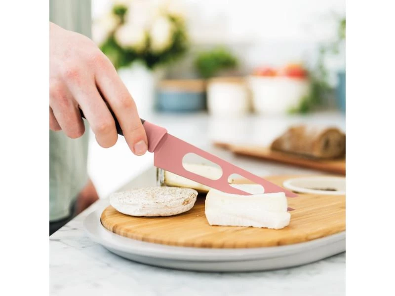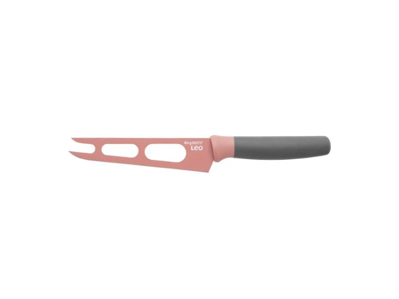 Cheese Knife 5″ Pink, Having a wine and cheese night with the girls? The 5″ pink Leo cheese knife is the perfect assistant to help you cut and serve a selection of delicious cheeses. The stainless steel blade cuts through hard cheese but is also fit for soft cheese that won’t stick to the blade thanks to the cut out sections. Once you’ve sliced the cheese, use the convenient fork-tipped spear for serving.
