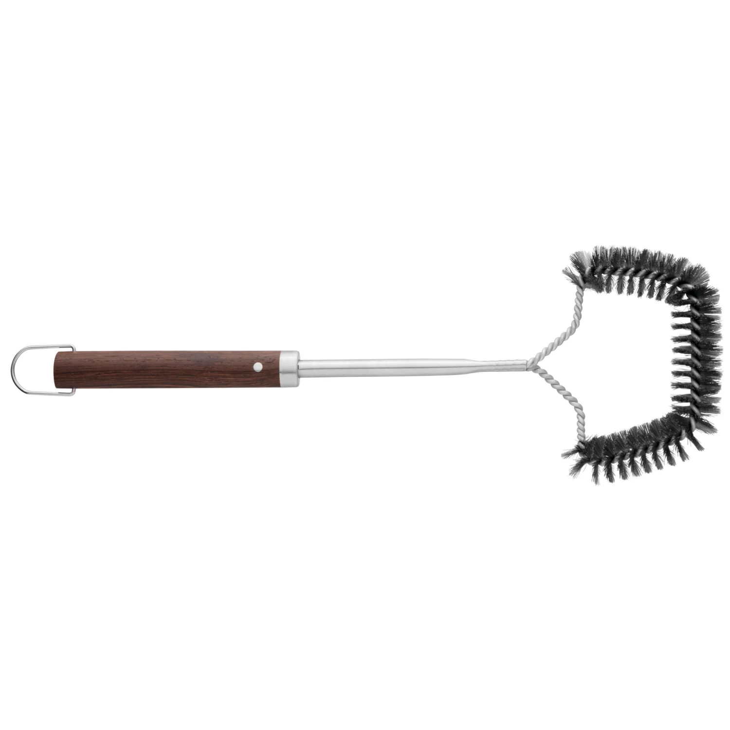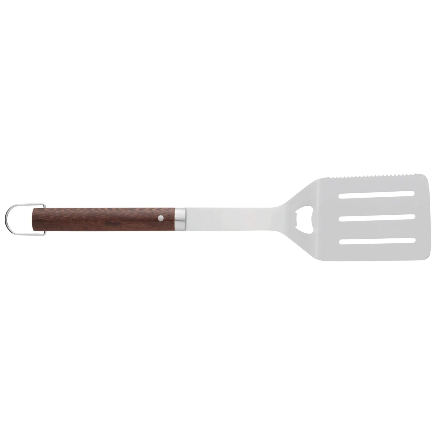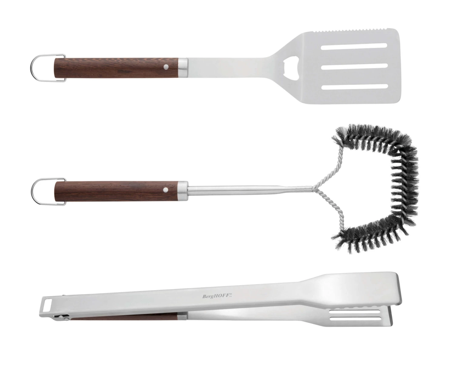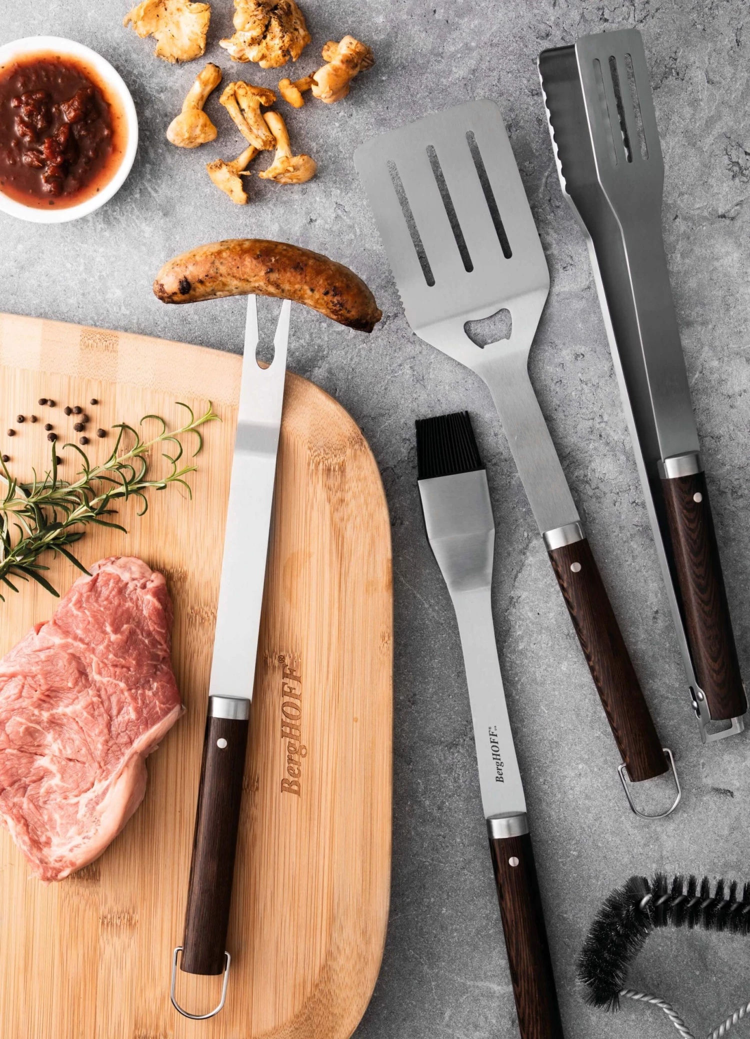A convenient pair of tongs to get a good grip on a wide variety of foods, a practical spatula to flip a burger, a steak or a larger piece of meat on the grill and a durable wire brush to clean your grill grate once you’ve enjoyed that delightful barbecue meal, with this 3-piece barbecue set you’ve got 3 essential grill instruments within reach. Each tool is made of high-quality stainless steel and has a long handle for extra safety which is covered in crack-resistant wood that gives the tools an authentic character and provides you with a steady grip. Set includes Tongs x1, Spatula x1, Wire Brush x1.